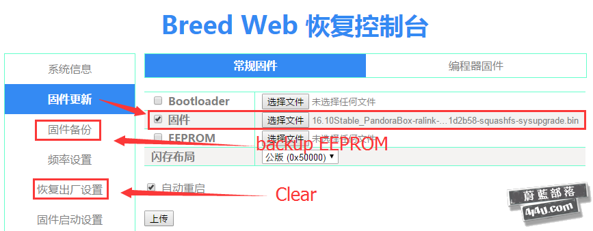 (1)升級bootloader:在breed Web下“固件更新”——“常規固件”——“Bootloader”,升級breed或uboot